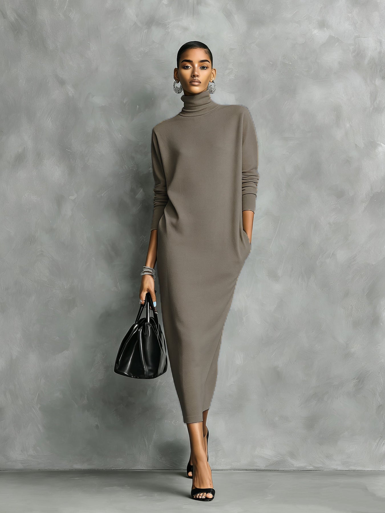 Elegantes schwarzes gestricktes Damen-Midikleid mit Rollkragen, langen Ärmeln und lockerer Passform (ohne Taschen)