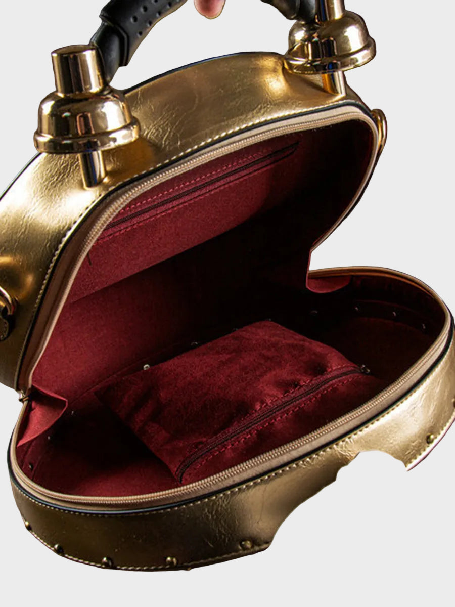 Przenieś się do innej epoki z Torebką Czasomierza, gdzie moda spotyka się z fantazją. Wykonana na wzór vintage'owego zegarka kieszonkowego, ta wyrazista torebka posiada w pełni funkcjonalny zegar osadzony w okrągłym korpusie, otoczonym ozdobną metaloplastyką i detalami inspirowanymi antykami.
